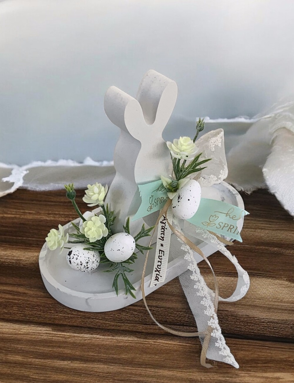 Πασχαλινό Διακοσμητικό Λαγουδάκι σε Πλατό με Άνθη